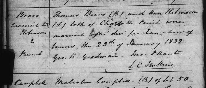 Sometime in the early 1830s Thomas married Jane Robertson. Although they could have met and married before coming to the Island, this wouldn't fit with Jane's story of being one of the few survivors of a shipwreck. I think the attached record for the marriage between Thomas Bears and Ann Robinson in 1832 in Charlottetown is this couple. (While the English names Jane and Ann don't sound alike, if her name was pronounced more like the French name Jeanne, then the minister could have heard Ann) Thomas and Jane's first daughter, Mary Anne, was also born in Charlottetown and baptized in that same church.