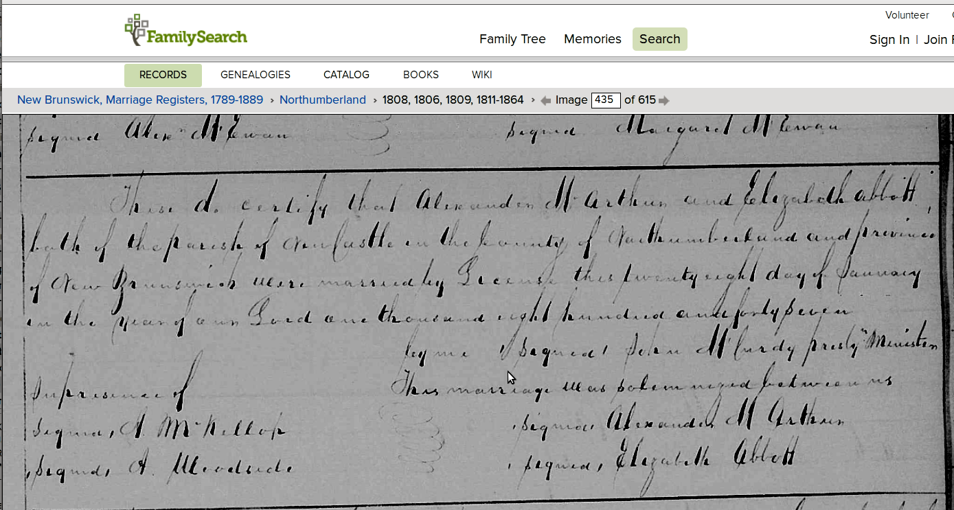 Elizabeth married Alexander McArthur from PEI in Newcastle in 1847; a witness at the marriage was A. Woodside, probably her brother in law Andrew. The marriage was reported in the Gleaner and Northumberland Schediasma February 2 1847: m. Thursday, by Rev. John McCurdy, Alexander McCARTHUR / Miss Elizabeth ABBOTT both of Newcastle par. (North. Co.) They were married in the Presbyterian Church.