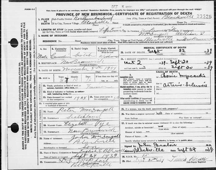 | Death | November 5, 1939 | Blackville, Northumberland, New Brunswick, Canada | NB archives, at age 87 | |