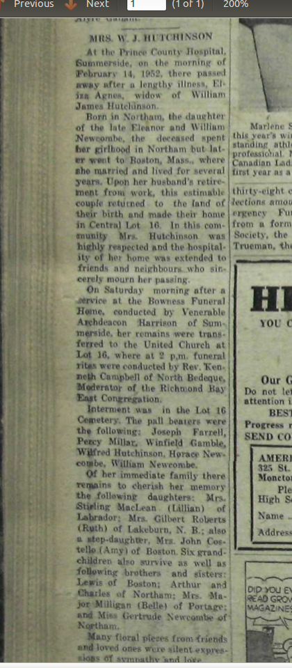 | Death | February 14, 1952 | Prince County Hospital, Summerside, Prince County, Prince Edward Island, Canada | dates from gravestone | |