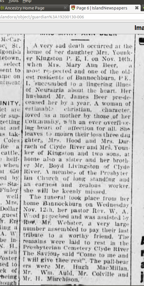 A very sad death occurred at the home of her daughter Mrs. Younker, Kingston PEI on November 10th, when Mrs. Mary Ann Beer, a most respected and one of the oldest residents of Bannockburn, PEI succumbed to a lingering illness of Neuraigla about her heart. Her husband, Mr. James Beer, predeceased her by a year. A woman of estimable Christian character loved as a mother by those of her community, with an ever overflowing heart of affection for all. She leaves to mourn their loss three daughters, Mrs. Hood and Mrs. Darrach of Clyde River and Mrs. Younker of Kingston and two sons, at home also a sister and her brother Mr. Boyd Livingston of Clyde River. A member of the Presbyterian Church of long standing and an earnest and zealous worker she will be keenly missed.