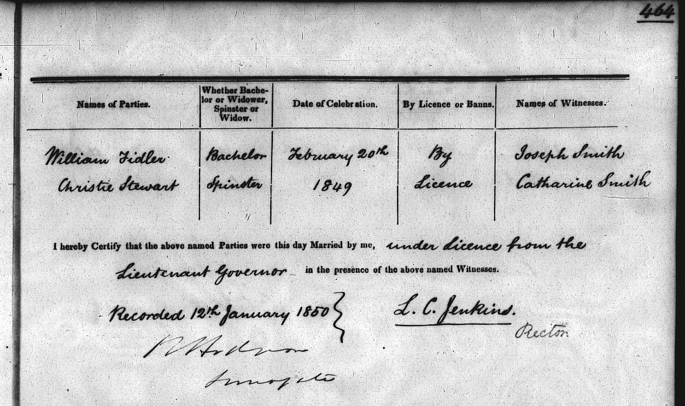 William Fidler married Christiana Stewart in Charlottetown, PEI in 1849. Witnesses were Joseph and Catherine Smith.