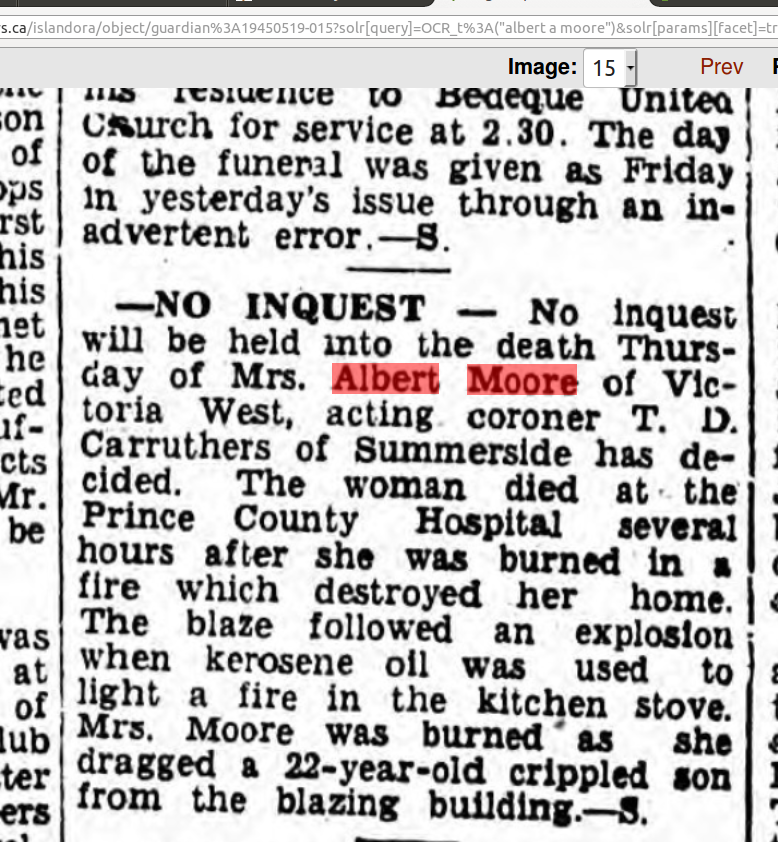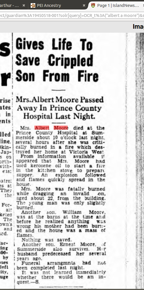 In Prince County Hospital Last Night. Mrs. Albert Moore died at the Prince County Hospital at Surn- merside about l0 o'clock last night, several hours after she was criti- caily burned in a fire which des- troyed her home at Victoria West From information available i! appeared that. Mrs. Moore had used kerosene oil ... NO INQUEST —- No inquest, will be held into the death Thurs- day of Mrs. Albert Moore of Vic- toria West, acting coroner T. l). Carruthers of Summerside has de- cid The woman died at the Prince County Hospital several hours after she