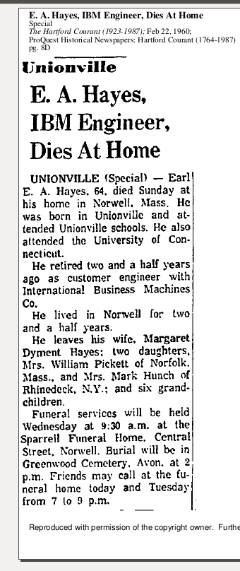 UNIONVILLE (Special) -- Earl EA Hayes, 64, died Sunday at his home in Norwell. ... Margaret Dyment Hayes; two daughters, Mrs. William Pickett of Norfolk.