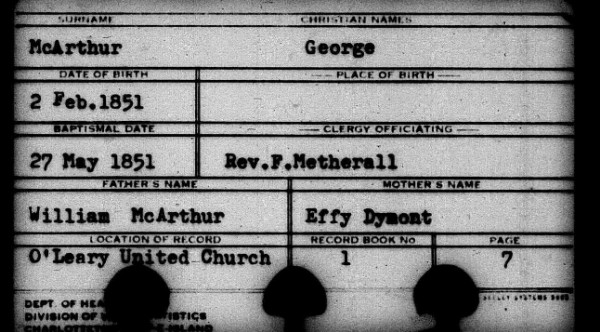 George Dyment, also known as George McCarter Dymond, was born on 2 February 1851 in Prince County Prince Edward Island, the son of William Dyment and Effie McArthur. In the PEI Baptismal Index, his parents names were reversed (Effy Dymont and William McArthur).