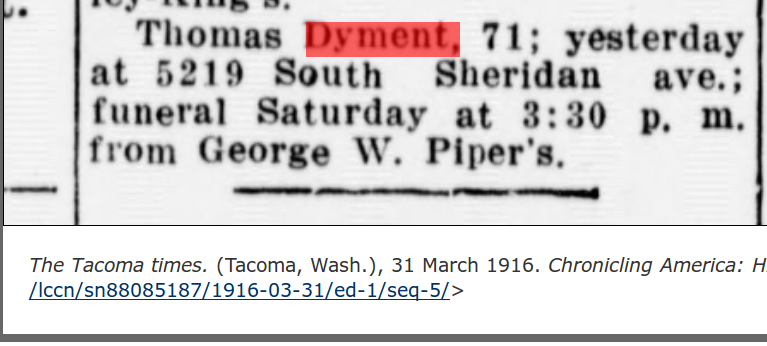 Matilda died at home on Asotin Street in Tacoma, Pierce, Washington on 16 April 1909 at the age of 61. Her obituary stated that she was survived by 6 sons and three daughters. Thomas died in Tacoma, at the home of his daughter, Mrs Jennie Hosmer, on South Sheridan Street, on 30 March 1916. (His parent's names on the death certificate were Humphrey Dyment and Barbara McArthur). He was survived by nine children: George of Prince Edward Island, Mrs Hosmer, John Dyment, William Dyment, Mrs Alice Williams, and Mrs Ethel Parker, all of Tacoma; Edward Dyment of Shelton, Thomas Dyment of Boston and Arthur Dyment of Idaho. He was also survived by 17 grand-children and one great-grandchild.