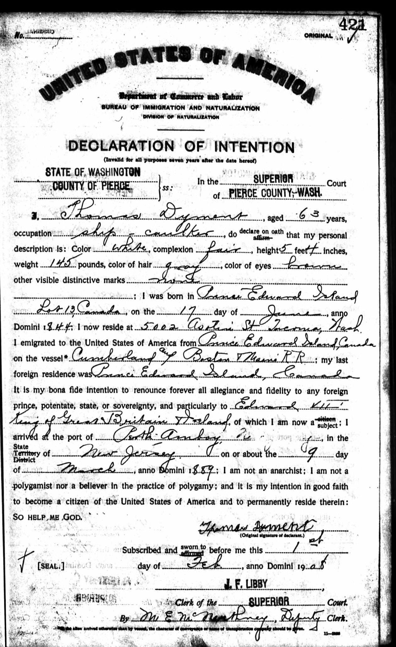 On his Declaration of Intention form for US citizenship, filled out by Thomas in February 1908, he supplied the following information: he gave his date and place of birth; he was 5'4", 145 lbs, with gray hair and brown eyes; his address was 5002 Asotin in Tacoma. His occupation had been ship caulker. He arrived in the States by train, the Cumberland of Boston & Maine. He had arrived in Perth Amboy New Jersey, not far from where his brother George had been living. He gave the date as 9 March 1889, but his sons Arthur and John said Fall 1891, which fits with census records. A descendant said in a posting that the family moved from the Boston area to Washington State in 1904, and this fits with information found in directories for Massachusetts and Washington State. Of the children, John, Alice, Edward, Thomas, William Herman , Ethel and Arthur went with their parents to Washington State. George stayed in Massachusetts. Jane went out later. Daughter Mary Matilda had been living in Maine, where she died at a young age.