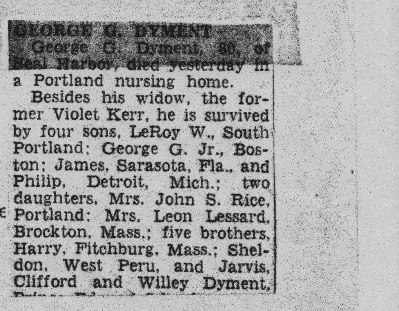 In 1910, the family name was Tyment in the US census. In 1920, children were Charles E. (17), Mima H. (15), Roy W. (13), Philip b. (11), and James R. (8). All of the children were born in Maine. In 1930, there was also Arline (16), who must have been missed in the previous census, and George Gordon Jr. (7).