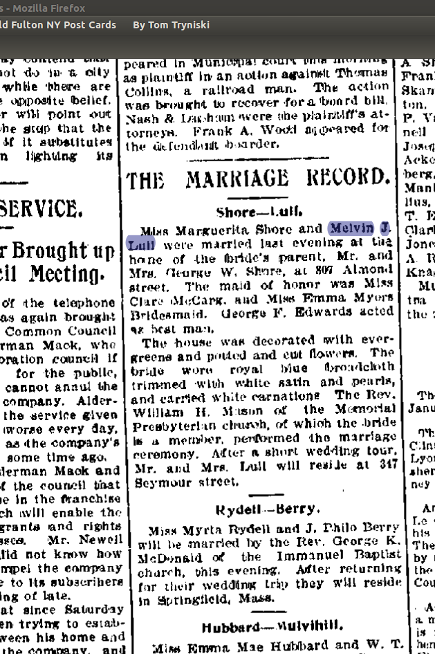 In failing health for several months, Mrs Rita Lull, age 57, died at her home Monday night. Syracuse Journal May 16 1933