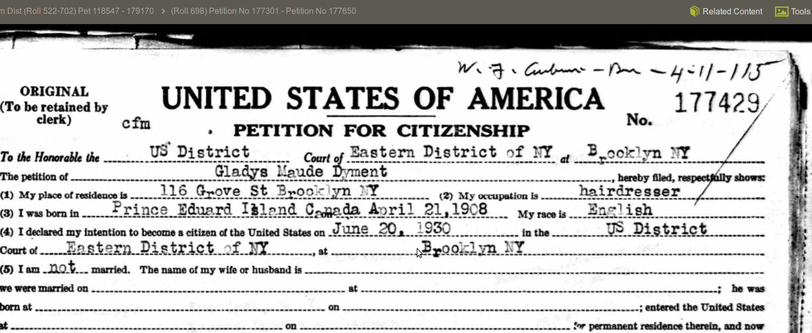 | Birth | April 21, 1908 | Prince Edward Island, Canada | date from naturalization records | 1b |