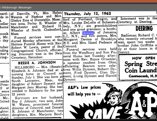 "Mrs (Bessie) Elizabeth A. Johnson died at a nursing home in Concord on Sunday July 1. She was born in South Lancaster, Mass. the daughter of Robert Dyment and Margaret Jane Murray. Survivors are her husband Roy J. Johnson and two sons, John W. Waters, a prominent undertaker. Donald R. Johnson of Manchester; two daughters, Mrs. Marjorie Bouffard of Portland, Or and Mrs. Louise De Lelia of New York; brother Albert Dyment of Jamaica, Long Island, New York, and two sisters, Mrs. Margaret Devine of Brooklyn and Mrs. Hazel Pedeare." Hillsborough Messenger July 12 1962