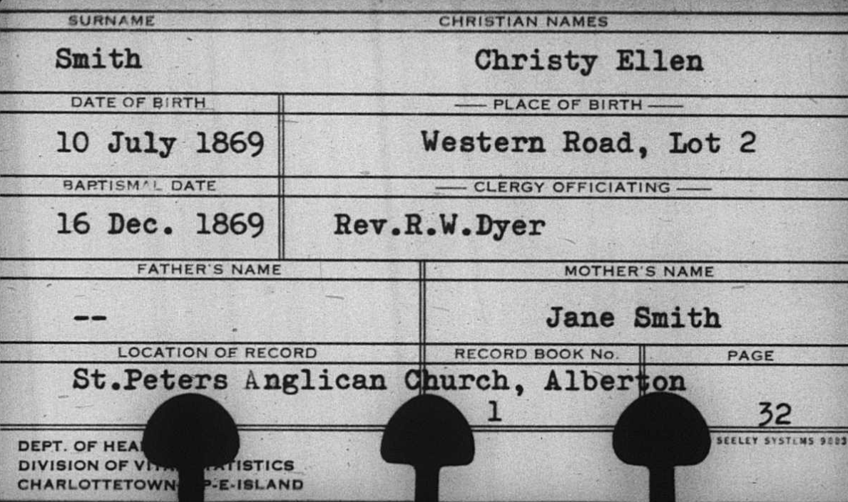 | Birth | July 10, 1869 | Kildare River, Lot 3, Prince County, Prince Edward Island, Canada | July 12 1871 on her gravestone, Holy Trinity Anglican Cemetery Alma Lot 3 | 1b |