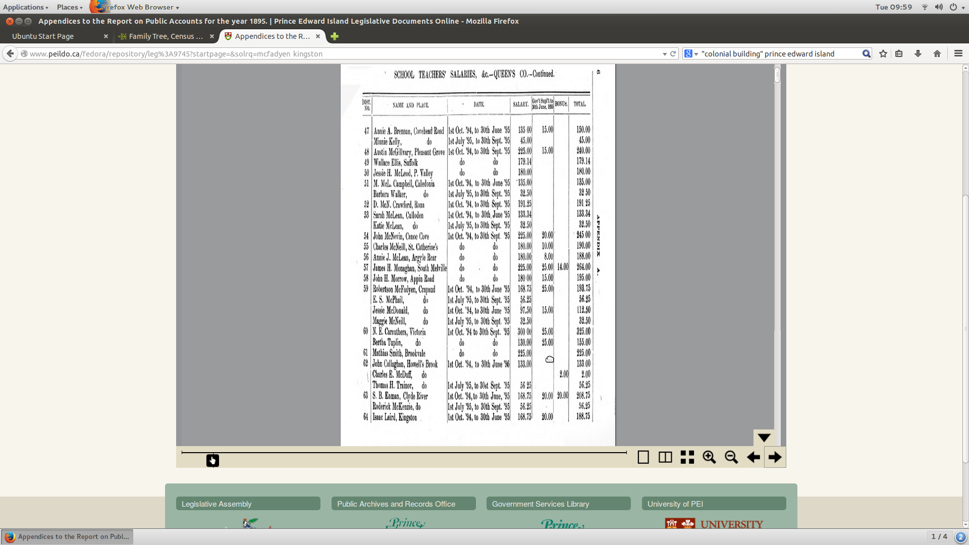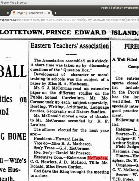 Robertson was living at home in 1881 and 1891, according to census records. He attended high school in Kensington, and perhaps this is how his sister Elizabeth met Johnstone Mann. He qualified for junior (1888) and senior matriculation (1889), receiving 190 marks out of 200, coming first. He received a teacher's license from Prince of Wales College (he is listed in an annual publication of the Prince Edward Island. Office of Superintendent of Education as attending in 1889), and from local histories of Bonshaw, Crapaud and Cornwall we know he was teaching on the Island in various locations - 1891-92 (Bonshaw), 1894 (Crapaud) and 1895-96 (Cornwall PEI); he could be the R. McFadyen in Springvale school in 1897.