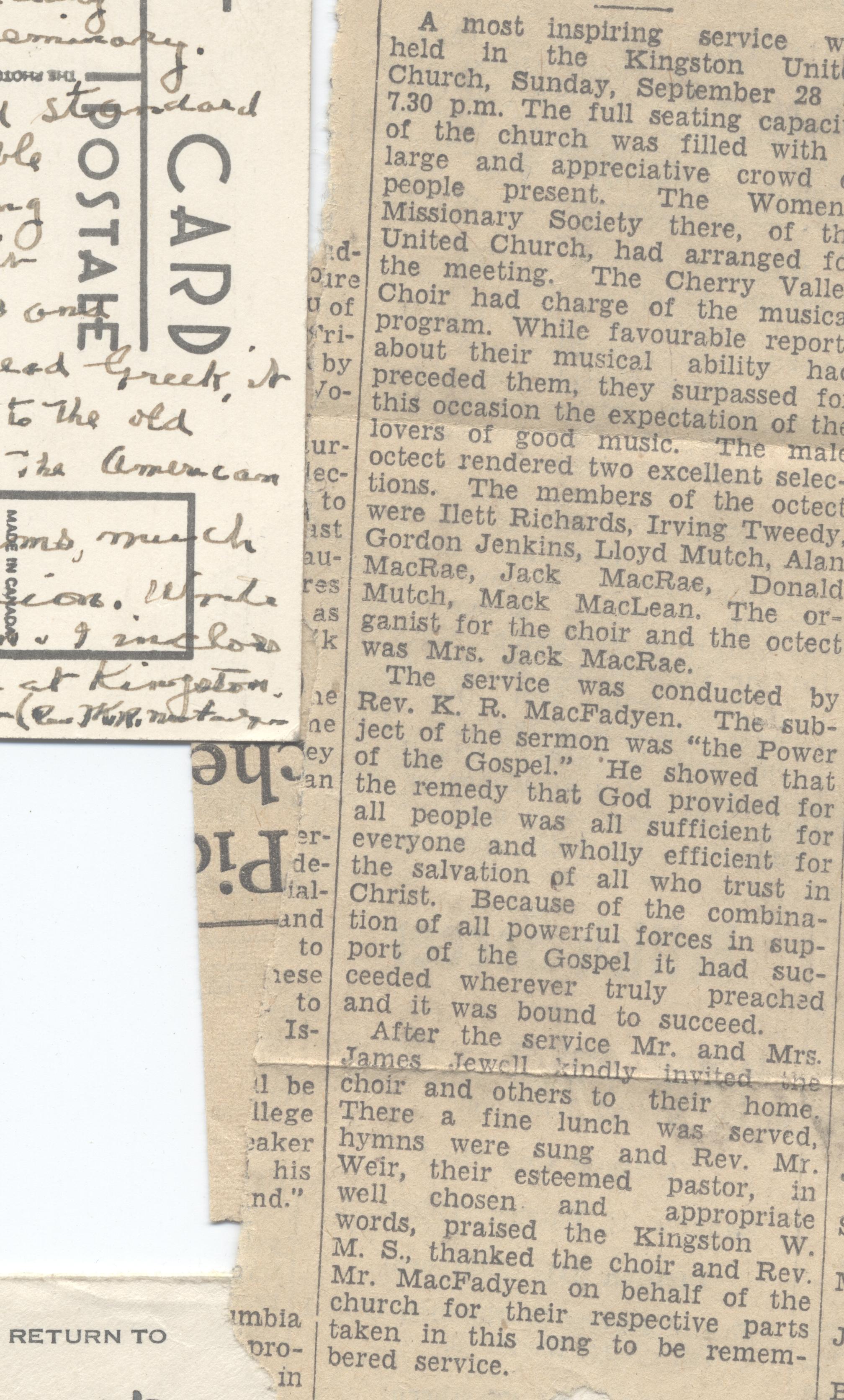 In the 1940s, a series of articles appeared in the Globe & Mail by "Rev. K. R. MacFadyen, B. D." K.R. MacFadyen also wrote letters to the editor, usually on religious/social matters.