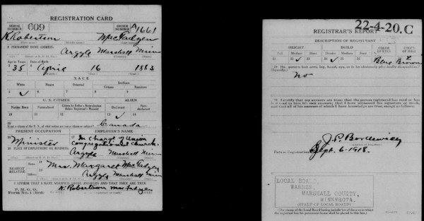 There is a registration form for the first World War in 1918, where Robertson gives Margaret MacFadyen at the same address as a contact. He also gave his year of birth as 1883, and his occupation as minister of a Congregationalist church in Minnesota, not a Presbyterian one. However, the signature on the form matched that on other items signed by Robertson; his first initial was K; and he was born in Canada. According to Presbyterian records, he was in Minnesota around this time. So was this a second wife, or is it his daughter, Miss Margaret MacFadyen? It looks more like Mrs. on the form. No record of a second marriage could be found for Robertson.