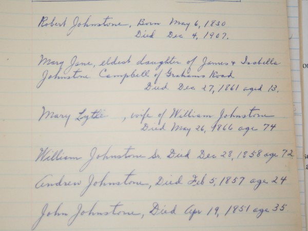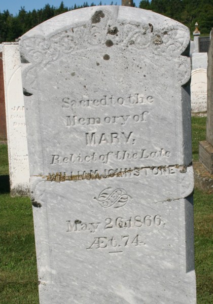| Death | May 26, 1866 | Long Creek, Lot 65, Queens County, Prince Edward Island, Canada | dates from tombstone at Geddie memorial; at age 74, w/o Wm Johnstone | |