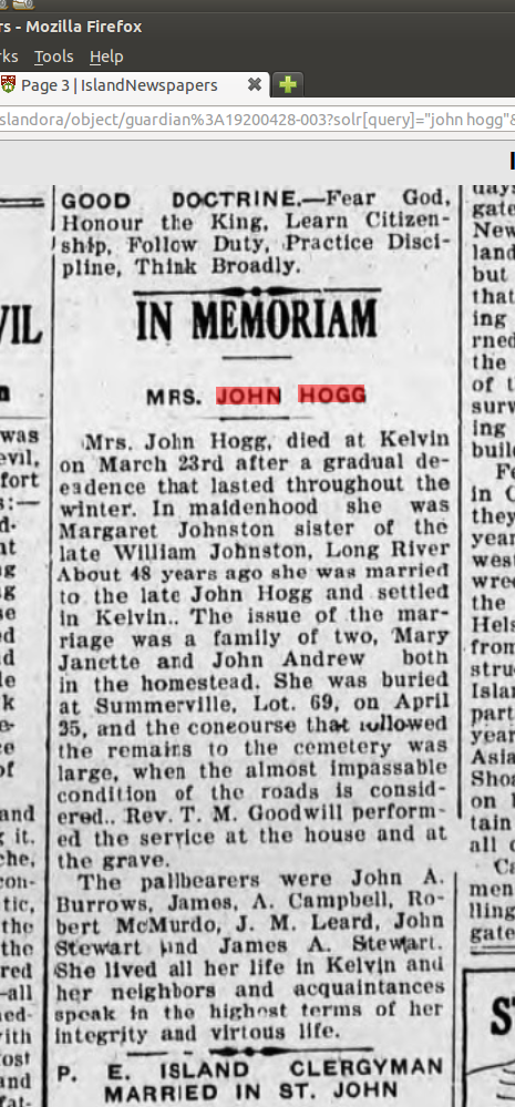 | Death | March 23, 1920 | Kelvin Grove, Lot 25, Prince County, Prince Edward Island, Canada | says April 23 1920 on gravestone in Lot 67 | |