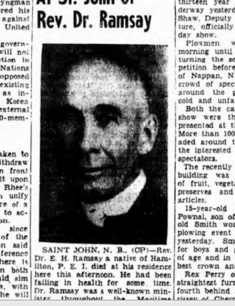 Many friends in this Province will re- gret to learn of the death of the Rev. Dr. E. H. Ramsay, which occurred on Wednes- day in Saint John. A native of Hamilton, 1P. E. 1., Dr. Ramsay was for nine years pastor of Trinity United Church in Char- lottetown, during which time he endeared .himself to all our citizens by his kindly and genial temperament no less than by his Christian zeal and devotion to his high calling.