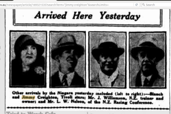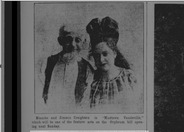 They were reviewed in a number of newspapers across the United States, and they toured in Australia in 1929. "Blanche and Jimmie Creighton, a real young couple whose good looks are camouflaged to a great extent by the makeup essential to the characters"... In their “Mudtown Vaudeville,” Jimmy impersonated a Down East Yankee farmer and Blanche a rosy-cheeked maiden who asked stupid questions.