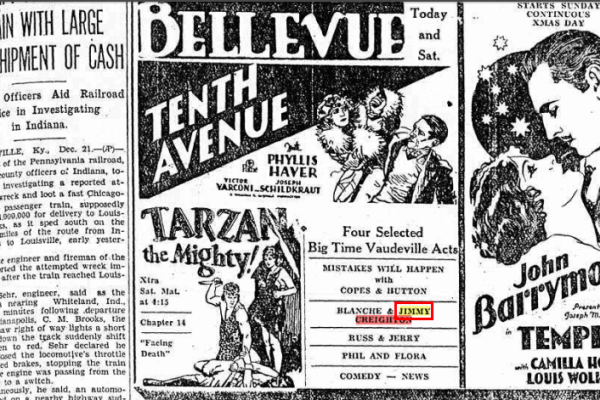 A big hit was scored by Blanch and Jimmy Creighton. The material is bright and witty, and Jimmy ranked high among "Rubes" seen around here. (Variety 1922) Blanche and Jimmy Creighton's hick dialogue Is funny but the rest of the bill might be seen almost any time. (1923) BLANCH AND JIMMY CREIGHTON "MUDTOWN VAUDEVILLE 1926 EXTRA FEATURE—TWO FORMER NEW BRUNSW1CKERS