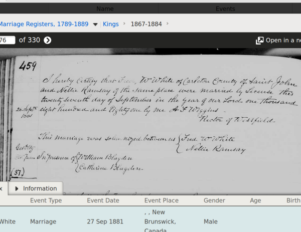 A Nellie Ramsay marred Frederick White in New Brunswick with William and Catherine Blagden, witnesses.