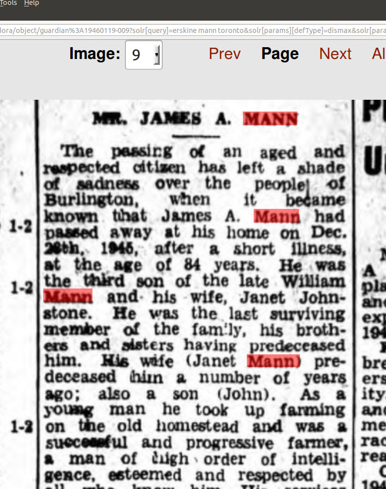 The passing of an aged and respected citizen has left a shade of sadness over the people of Burlington when it became known that James A. Mann had passed away at his home on Dec 26th 1945 after a short illness at the age of 84 years. He was the third son of the late William Mann and his wife Janet Johnstone. He was the last surviving member of the family, his brothers and sisters having predeceased him. His wife (Janet Mann) predeceased him a number of years ago; also a son (John). As a young man he took up farming on the old homestead and was a successful and progressive farmer, a man of high order of intelligence, esteemed and respected by all who knew him. His services were always aet the command of his friends and neighbours. He lived his religion day by day. To his fellow man he showed it in many ways in kindness and generosity to those in need, and willingness to aid those in time of trouble. There are left to mourn the loss of a loving father four son, Erskin of Toronto, William of Montreal, Elmer , Indian River, Waldon at home; two daughters Bessie, Mrs. James Anderson Montreal; Ruby at home.