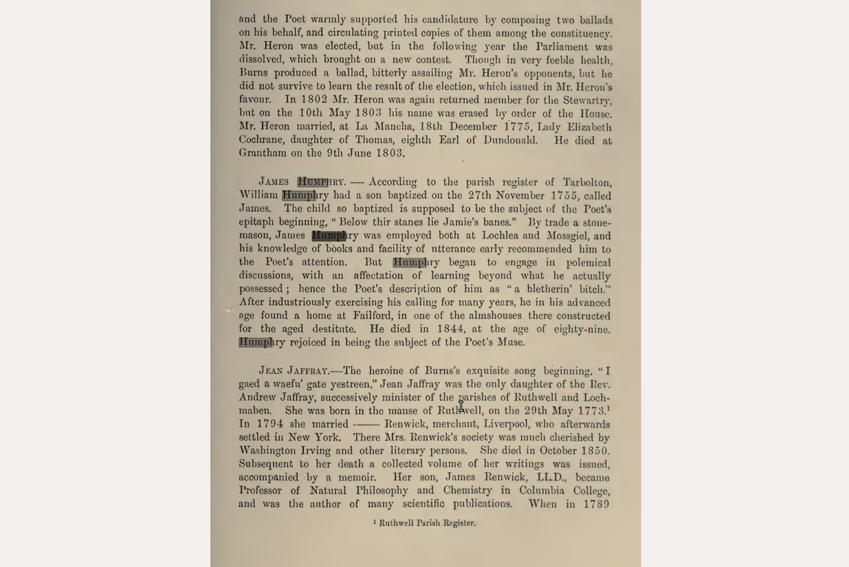 THE Herald noted: ''Died, at Blackhill, near Tarbolton, James Humphrey, in the 86th year of his age. The deceased was a contemporary and acquaintance of our great Ayrshire Bard. ''When the Sons of Burns visited Tarbolton some months since, Humphrey was brought to that town in carriage and introduced to them. In the removal of the deceased, another of those links, which connected Burns to the present generation, is broken. A few years more, and the scanty number of his personal acquaintances will be gathered to their fathers.'' Glasgow Herald (Glasgow, Scotland), Monday, December 30, 1844; Issue 4374.