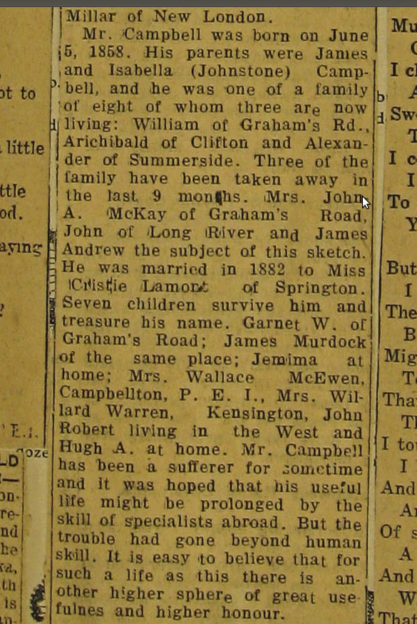 John R. and Hugh A.1901 census Lot 20 *see entry on James Andrew Campbell in Past & Present of PEI
