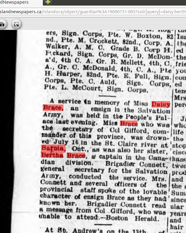 Daisy had been living in Boston with her brother Nelson and her mother Olivia, working as a stenographer. She had gone to Sarnia to visit her sister Bertha, who was with the Salvation Army. They had planned to spend their August birthdays together. Daisy, the stronger swimmer, attempted to save her sister.