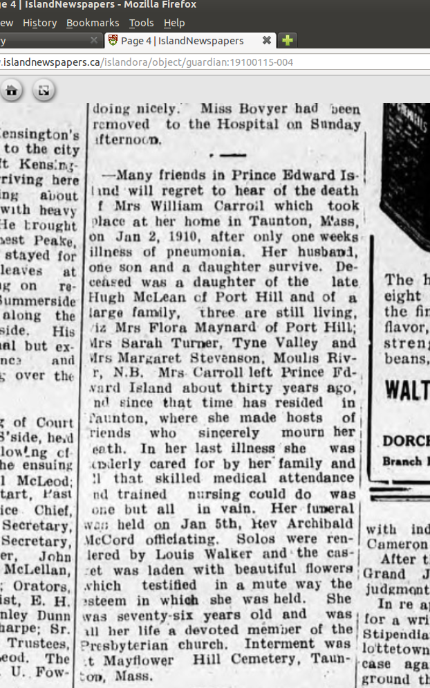 Deceased was a daughter of the late Hugh McLean, of Port Hill. Mrs. Flora Maynard, of Port Hill, Mrs. Sarah Turner, Tyne Valley, and Mrs. Margaret Stevenson, Moulis River, N.B., are sisters.