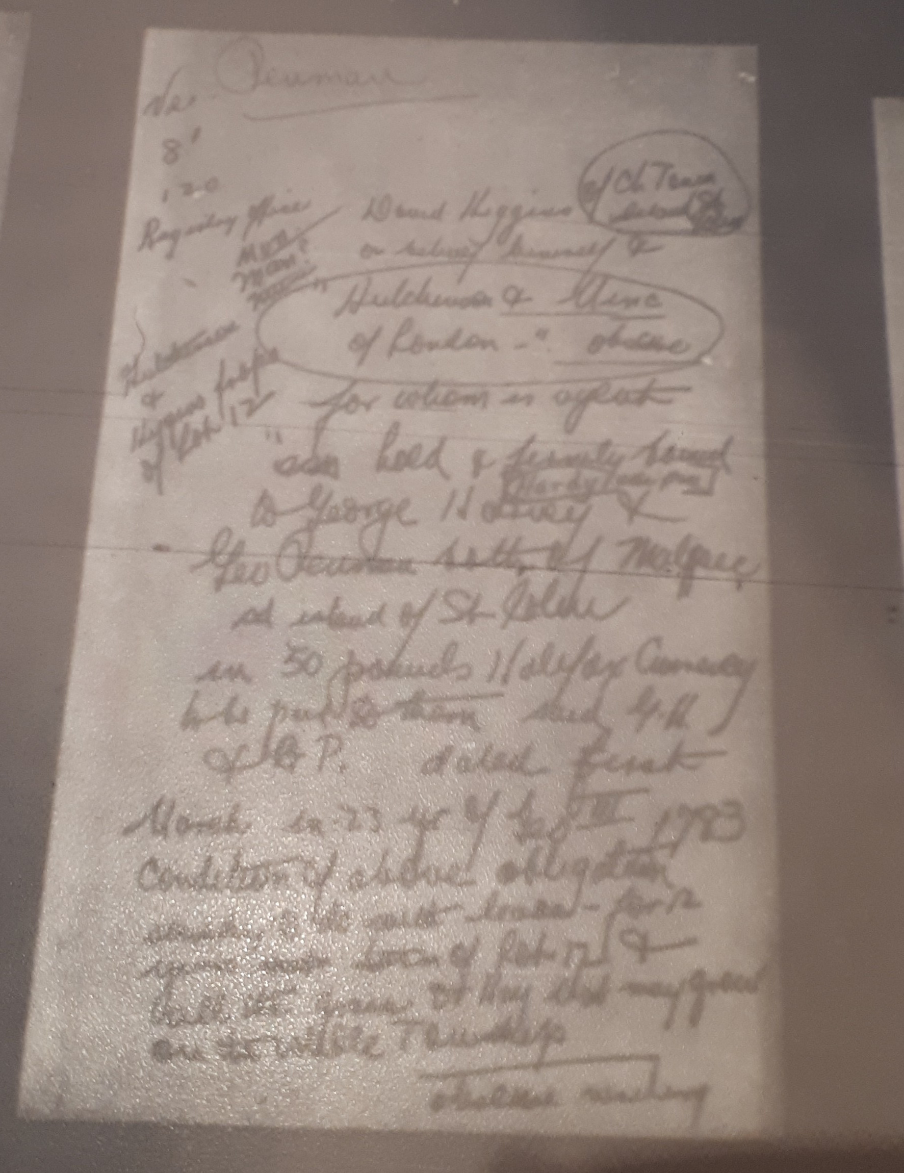 In 1783, a document, an obligation or lease of some sort, involving George Penman and George Hardy was summarized on a note taken by Leard - it was a Registry Office document - the other names were David Higgins, of Charlottetown, acting for himself and Hutchinson & ?, of London, who may have been proprietors of Lot ?. Leard's summary mentions 50 pounds of Halifax currency, and something about use of hay, but otherwise I can't make out his writing.