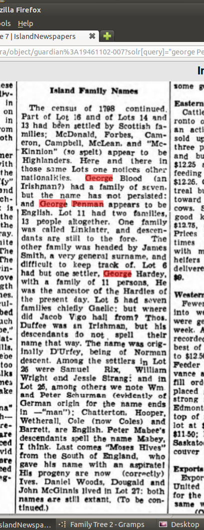 Douglas Sobey, in his article for the Island Magazine, A Journey Across Lot 13 in 1793, summarized Gray's diary, which mentioned George Penman. Gray wrote: "I persisted in saying I should proceed alone if none would accompany me. George Penman though 60 years of age declared his purpose of attending me..." Gray's maps show the farms, on the banks of the Conway (now Trout) River as being inhabited by Roderick Gillies, Donald Ramsay, Malcolm Ramsay and George Penman.
